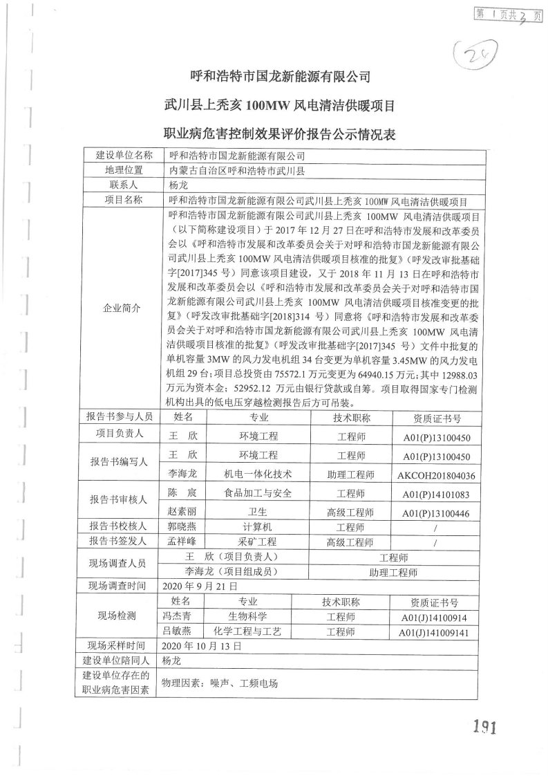 下一篇: 呼和浩特市國龍新能源有限公司武川縣上禿亥二期50MW風電清潔供暖項目職業(yè)病危害控制效果評價